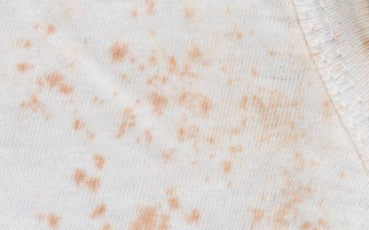 겉은 덩어리로 붙어 있는데, 그 아래에는 얇게 스며든 막이 남아 얼룩처럼 보이거나 뻣뻣함이 남습니다.